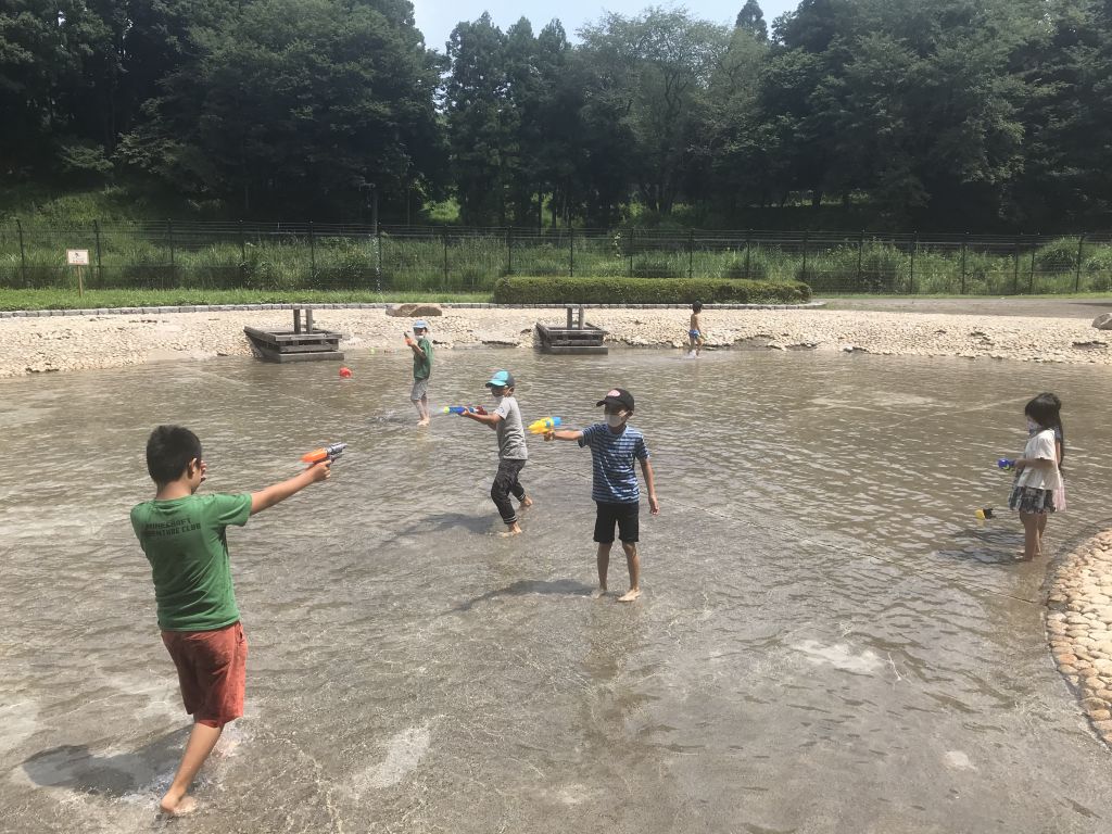 公園での水遊びもひと工夫!水鉄砲を使う事で、自然と距離を保ちながら遊びます!