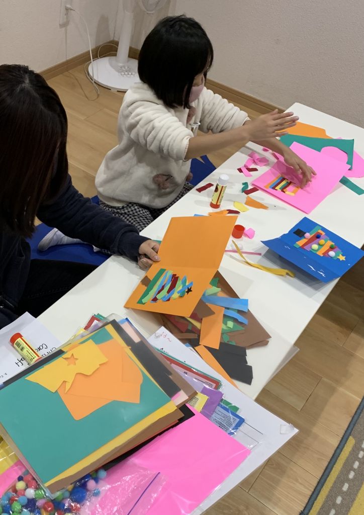 好きな色の画用紙を切って貼ってカラフルなツリーにしたり、