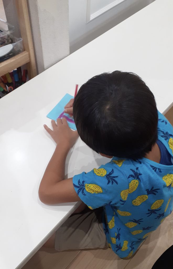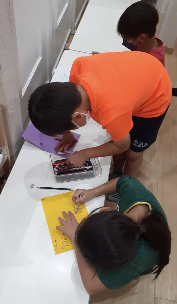The kids decided on a colour for their card and wrote a thank you message in English.