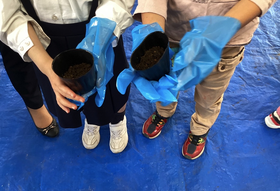 みんなで土を触ってポットに3粒ずつ種を植えました。