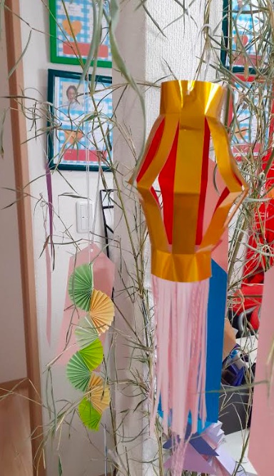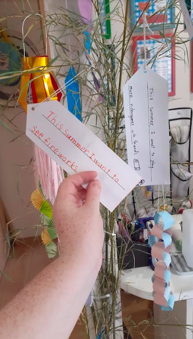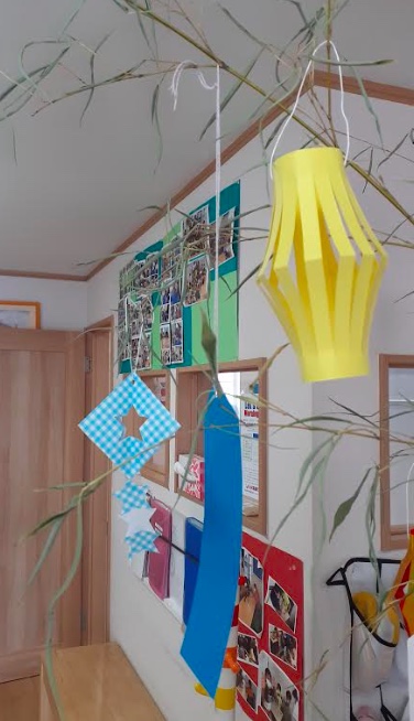 さて7月前半は七夕でした。 子どもたちは英語で願い事を書いて笹に吊るしました。