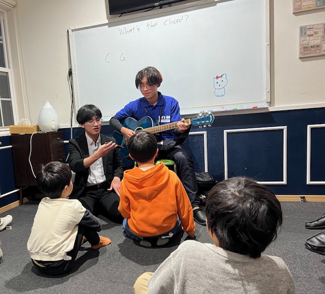 まずは、ギターのコードクイズから始まり、最後はみんなで大合唱。