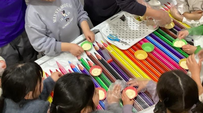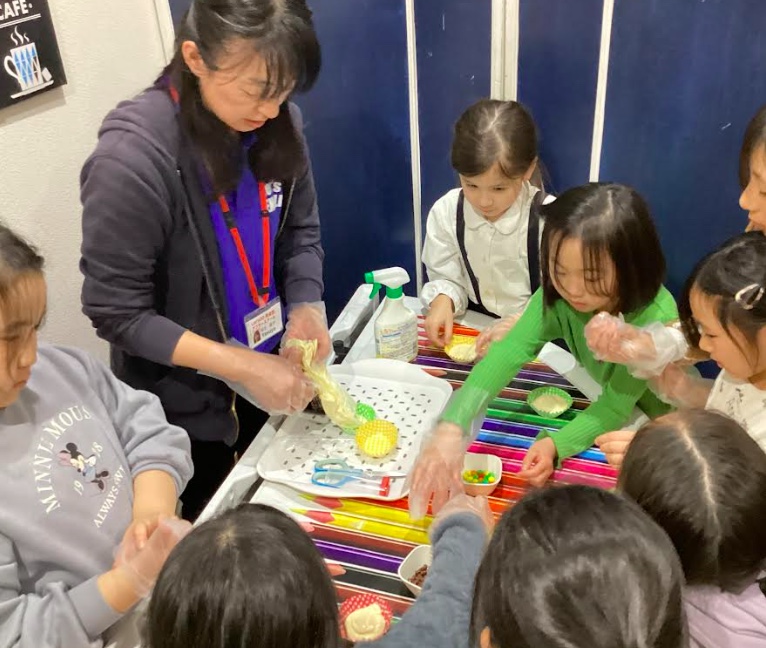 順番に生地をこね、それから先生がカップに生地を入れるのを辛抱強く待ちました。そして、チョコチップやM&Mチョコ、カラフルなトッピングでデコレーション。