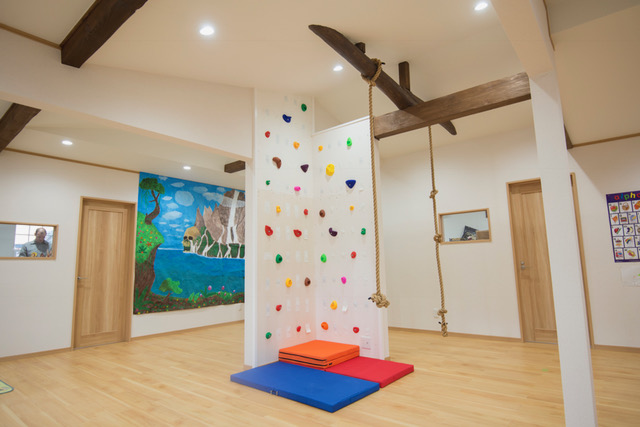 天井高くからぶら下がったこのロープが子どもたちは大好きで、教室に入ってくるなり飛びつきます。力いっぱいロープによじ登ったり、ターザンのようにスイングしたりして遊びます。