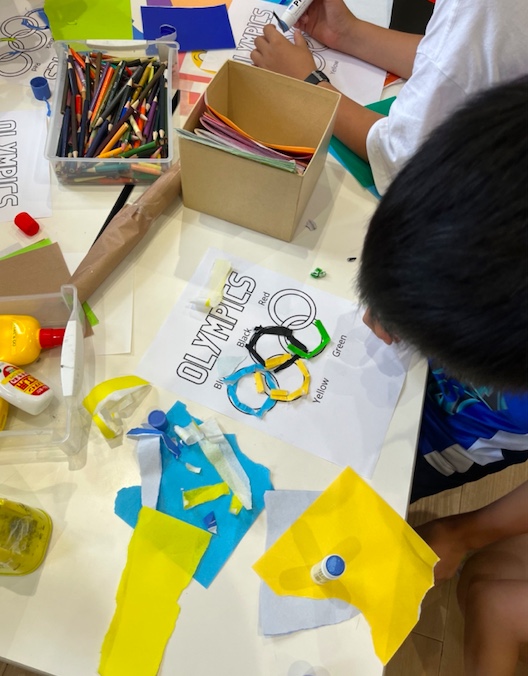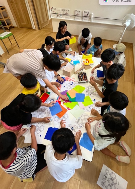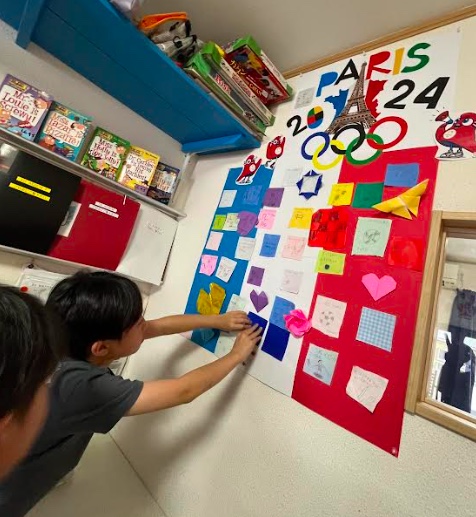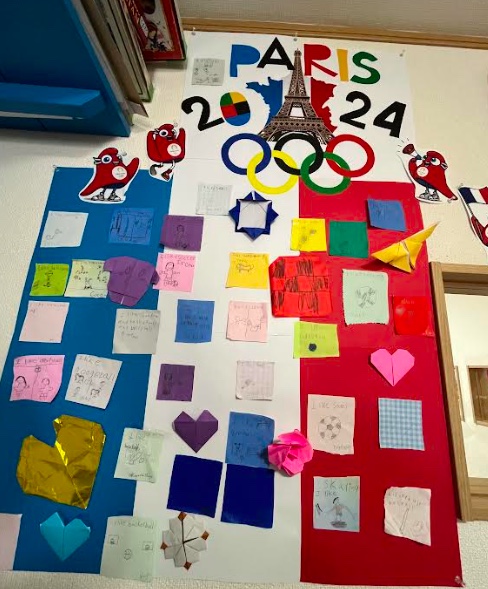 For this event, the children wrote their favorite sports with the writing “I like 〜” on a piece of paper. Our artistic teacher, Stan created a big French flag near the entrance. Everyone put there pieces of paper there and decorated it beautifully.
