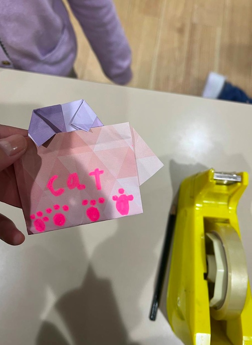工作の時間には、子どもたちは英語の知識を創造的に活用し、作品にラベルを貼ったり、習った単語を練習したりしました。
