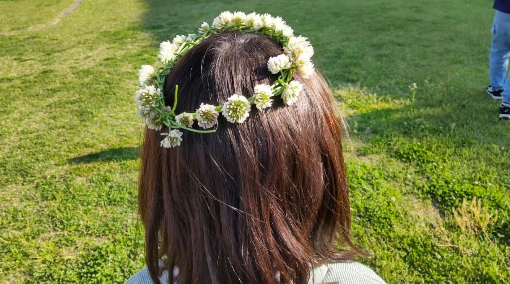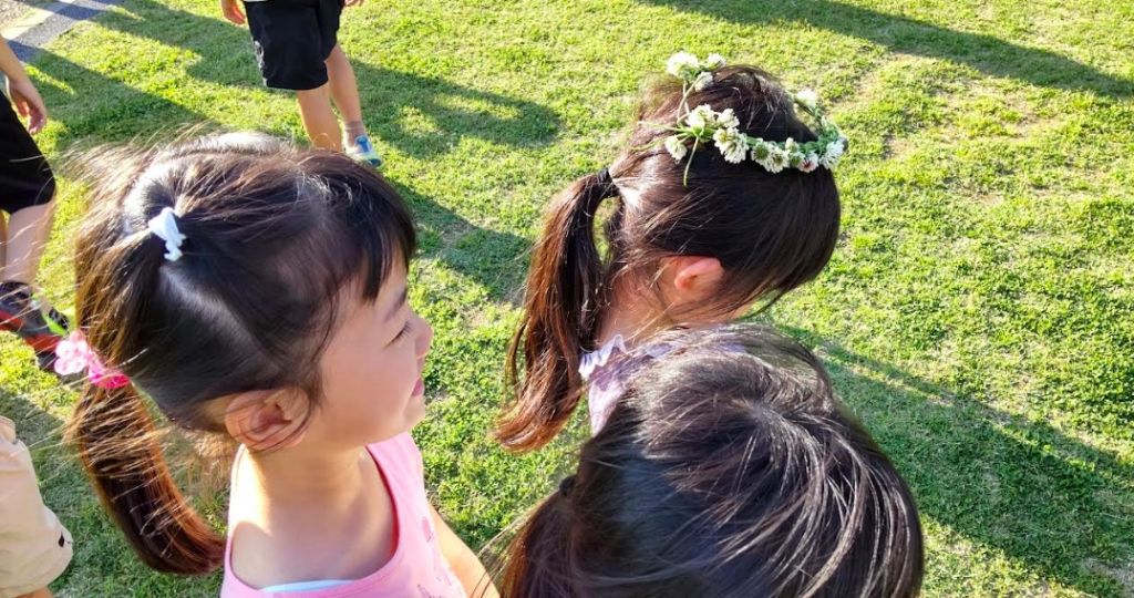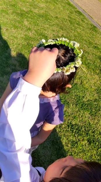 男の子は汗を流してボールを追いかけ、女の子は白詰草を積んで冠作り。