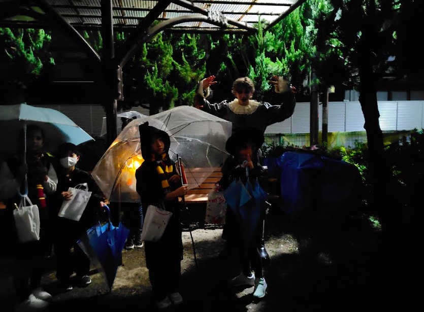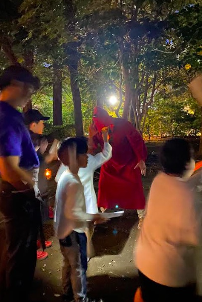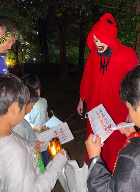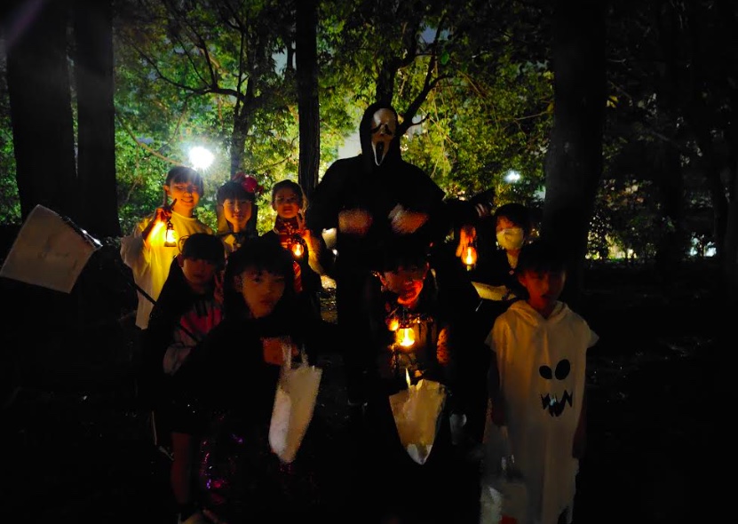 Benの合図で、今月の歌 ”Ghostbusters” を歌い終えたら、 いよいよ夜道の「Trick or treat」に出発です!