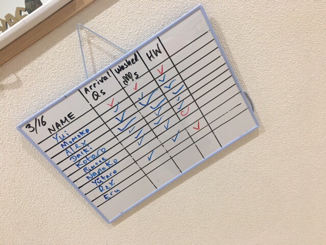 宇都宮のキッズ英会話スクール、Let's Go英会話では、子供たちがスクールに着いたら先ずは決められたルーティンをこなします。決められたタスクを済ませたら、先生に報告。そして壁にかけられたチャートに自らチェック印を付けます。タスクをこなすことで子供達は達成感を味わえます。また、タスクを早くこなせばプレイタイムがその分多く得られるというご褒美もついてきます^^
