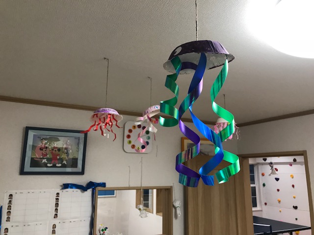 どうぞお教室の入り口のクラゲ達をみに遊びにきてくださいね!もうじき日本では「海の日」の祝日です。ビーチへお出かけのみなさん、クラゲには気をつけてくださいね^^
